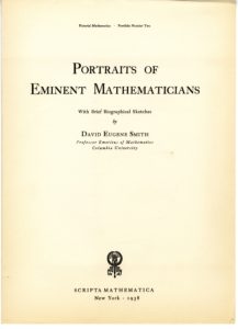 The 1939 World’s Fair opened in New York with the optimistic theme, “The World of Tomorrow.” The Fair organizers envisioned a future world of 5000 years of tomorrows, earth dwellers of 6939, who would be intrigued by the civilization of their ancestors. The Westinghouse Company took on the challenge of creating a time capsule capable of lasting 5,000 years and curating its contents. A Yeshiva College publication, Portraits of Eminent Mathematicians by David Eugene Smith, was selected to be part of this treasure, buried at the site of the World’s Fair on September 23, 1938. Portraits of Eminent Mathematicians was an offshoot of Yeshiva’s periodical, Scripta Mathematica. Scripta Mathematica was the brainchild of Yeshiva College mathematics professor Jekuthiel Ginsburg, editor of the quarterly from its inception in 1932 until his death in 1957. Jekuthiel Ginsburg at work.In the words of David Fleisher, professor of English at Yeshiva College, “The honor accorded these publications [Scripta] at the World’s Fair was a significant indication of the world-wide recognition which in a few short years the purposes and accomplishment of Scripta had achieved.” Portraits of Eminent Mathematicians. 1946 reprint. Portraits of Eminent Mathematicians, 1938 Portraits of Eminent MathematiciansBernard Revel, President of Yeshiva College, explained in the first issue of Scripta that “the policy of the Journal is in agreement with the ideal of ‘learning for the sake of learning’ which inspired the founders of Yeshiva College.” The initial issue also described the goal of the periodical: it