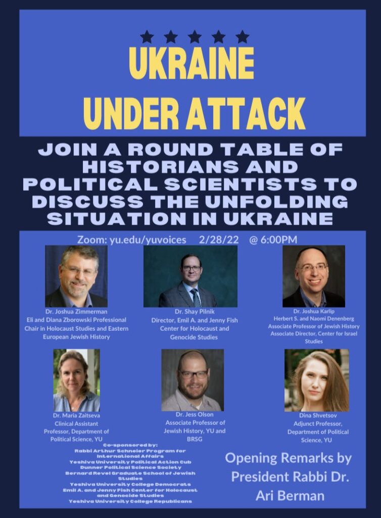A round table of historians and political scientists discussed the unfolding situation in Ukraine. Opening remarks by President Ari Berman. Contributors included Jess Olson, Associate Professor of Jewish History, Revel Graduate School; Joshua Karlip, Herbert S. and Naomi Denenberg Chair of Jewish Studies; Joshua Zimmerman, Eli and Diana Zborowski Professorial Chair in Holocaust Studies and East European Jewish History; Maria Zaitseva, Clinical Assistant Professor, Department of Political Science; Dina Shvetsov, Adjunct Instructor, Department of Political Science; and Shay Pilnik, Director, Emil A. and Jenny Fish Center for Holocaust and Genocide Studies. Recorded February 28, 2022.